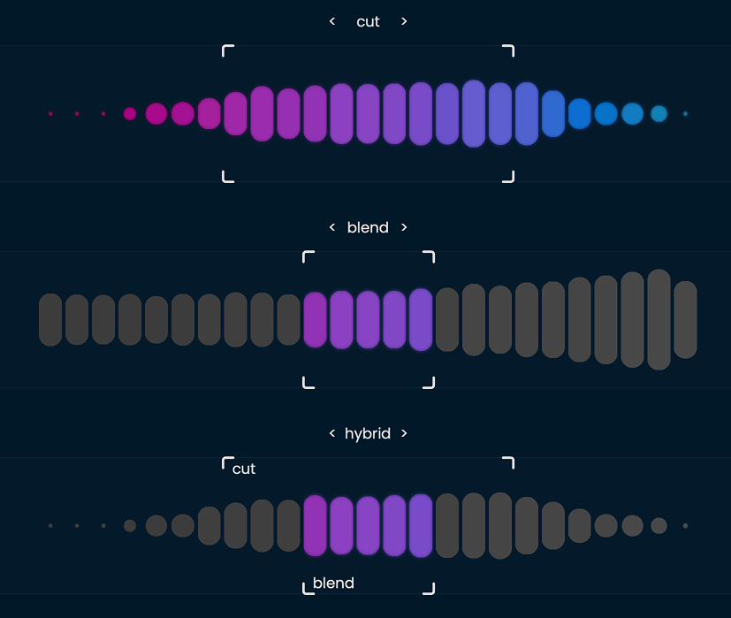 - hybrid allows you to both cut and blend, but the cuts work slightly different than filter mode -- they are not affected by the dry/wet knob so that you can blend without undoing your high and low cuts